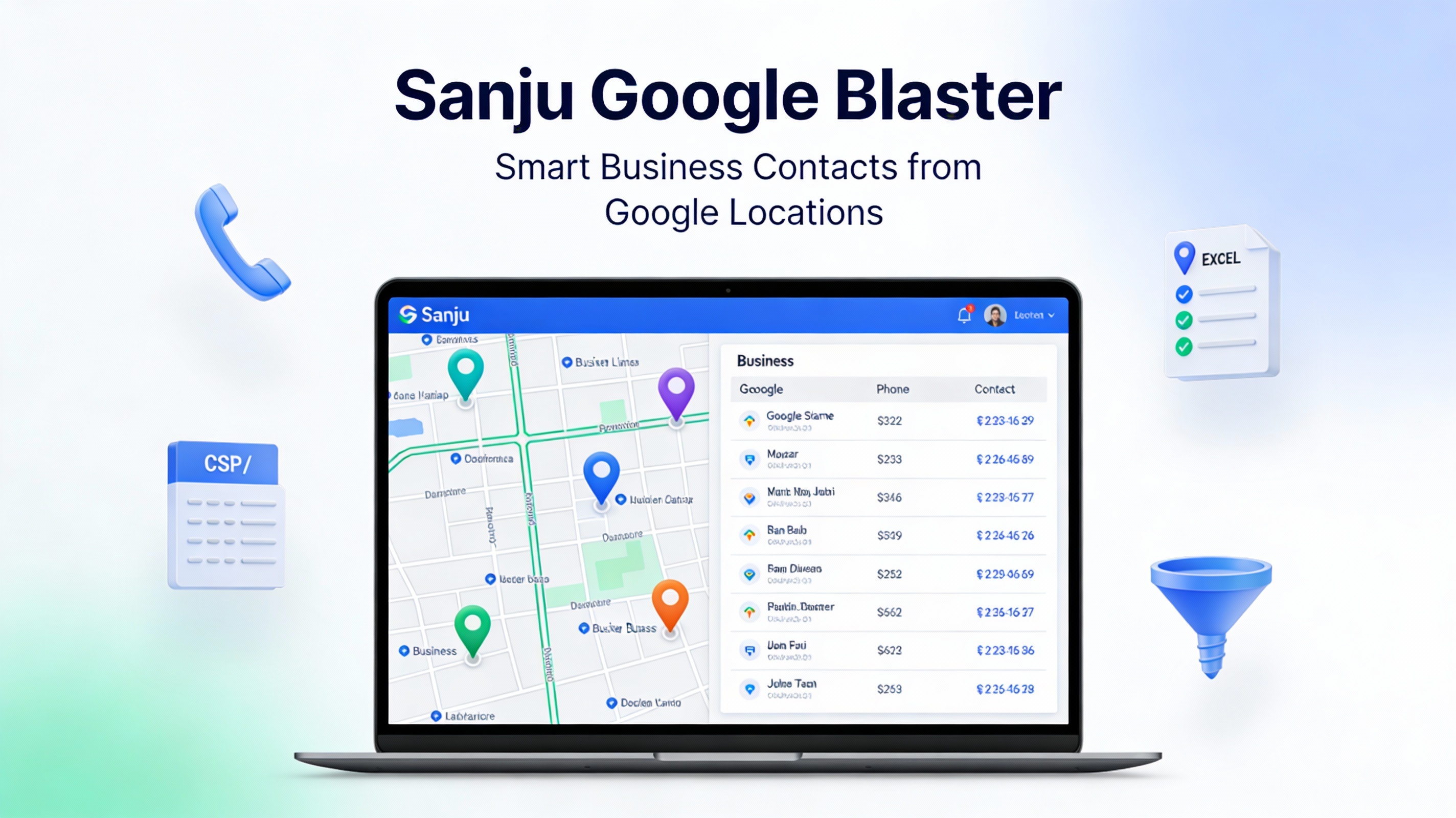Launch Sanju Google Blaster today and turn Google locations into a powerful B2B contact engine for your business.